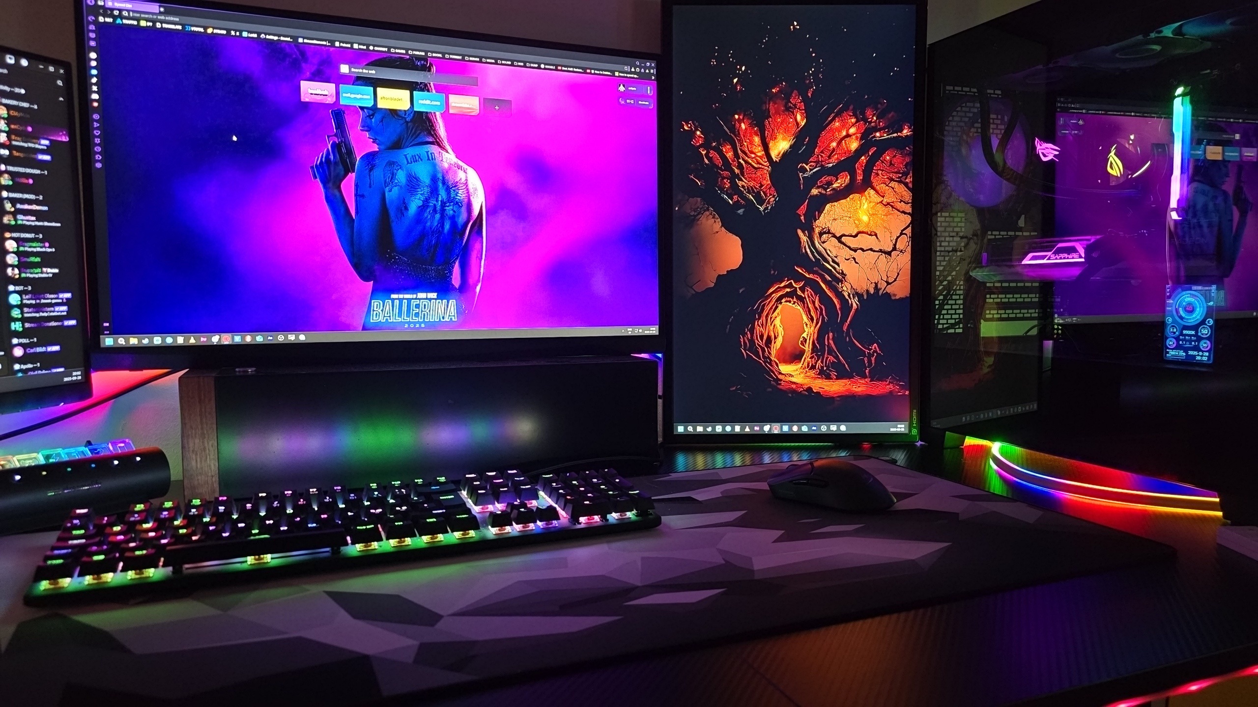 Jag minns när jag hade två maskiner – vilket jävla röra det var med alla kablar, skärmar och annan dynga. Det såg liksom ut som cockpiten på ett rymdskepp med alla monitors, och all annan utrustning. Idag känns det dock som att man har vuxit upp lite och fått mer ordning på grejorna, haha. Tycker ändå att färgerna passar bra och att mysfaktorn är hög.